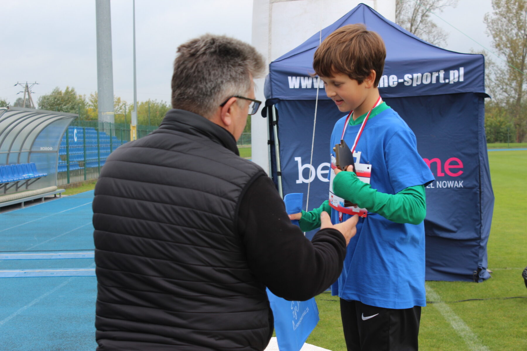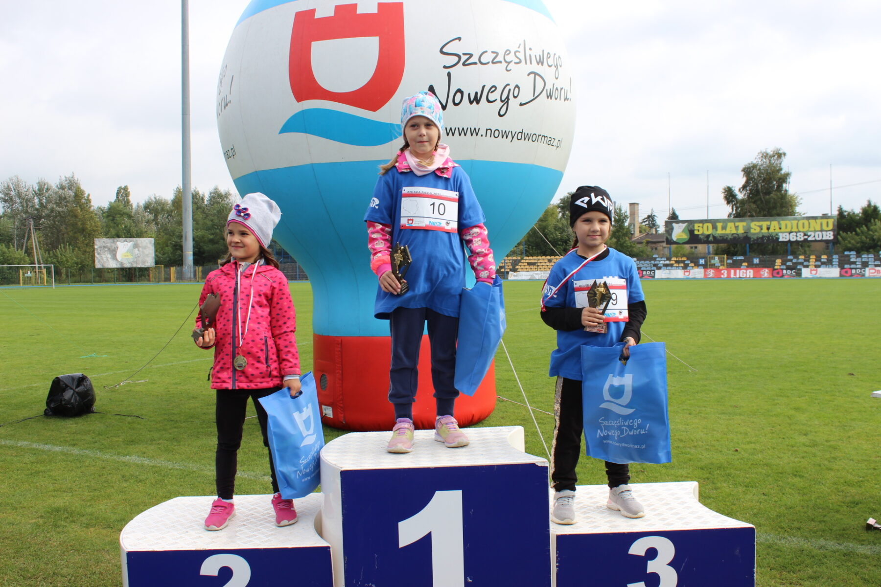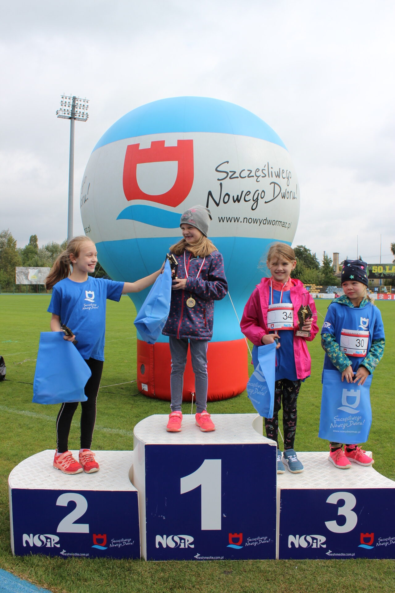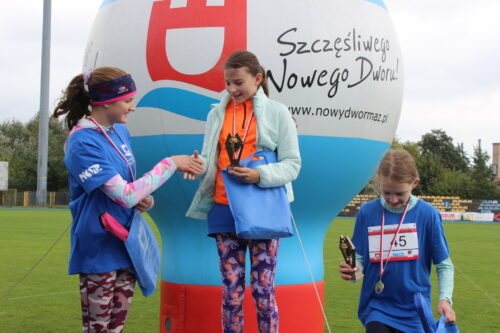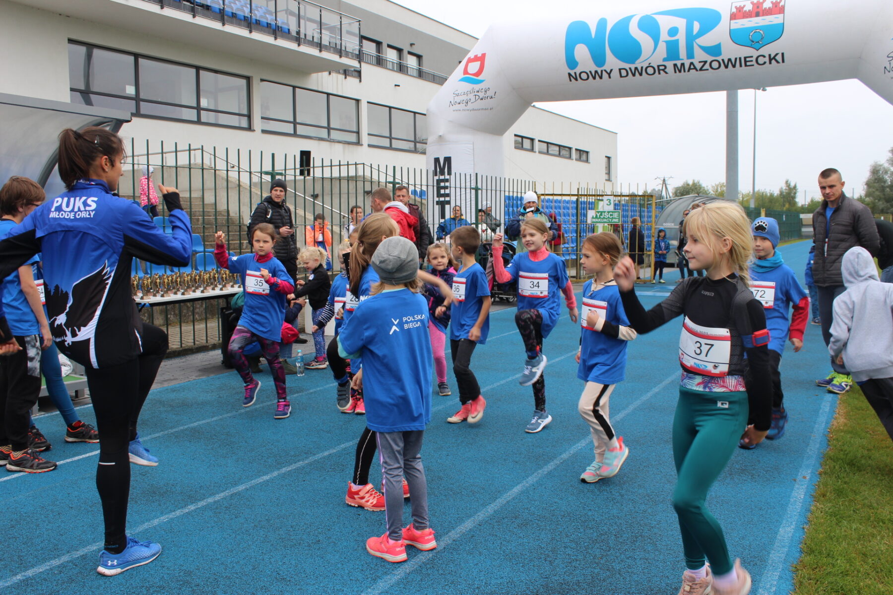 Pomimo początkowo dość jesiennej aury, humory i mobilizacja dopisywały, zwłaszcza wśród najmłodszych biegaczy, dla których to były pierwsze zawody. Przed każdym biegiem Pani Iwona Wicha przeprowadziła również rozgrzewkę. I tu chcielibyśmy wspomnieć, że Pani Iwona to 3-krotna Mistrzyni Europy Juniorów w biegu na orientację (w sztafecie i indywidualnie), a także wice mistrzyni świata w biegach po schodach. Co ciekawe, mąż pani Iwony, jest mistrzem świata w tej samej dyscyplinie. Wszyscy uczestnicy otrzymali pamiątkowe medale oraz wodę, natomiast najlepsi dodatkowo pamiątkową statuetkę oraz upominki, wręczane przez dyrektora NOSiR, Pana Dariusza Wąsiewskiego. Dodatkowo każdy chętny mógł spróbować swoich sił w biegach na orientację, które przeprowadzili PUKS „Młode Orły” Nowy Dwór Mazowiecki był to świetny sprawdzian przed Crossem Złotych Liści, który odbędzie się już 23 października