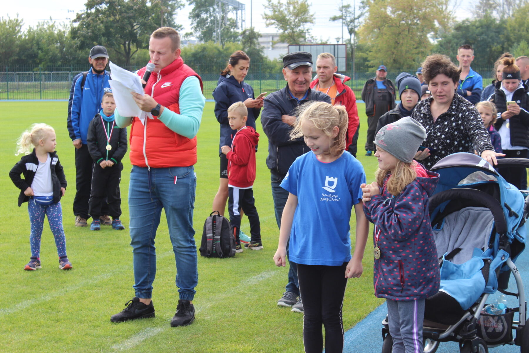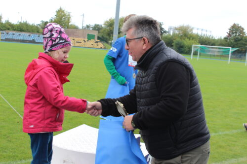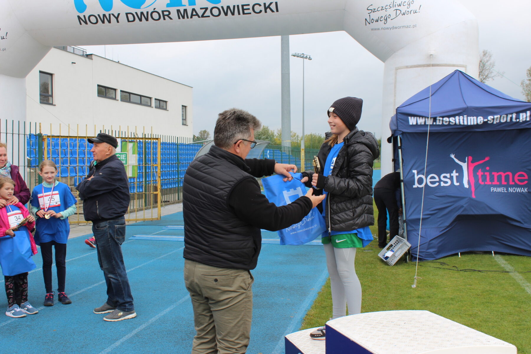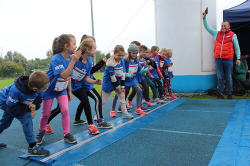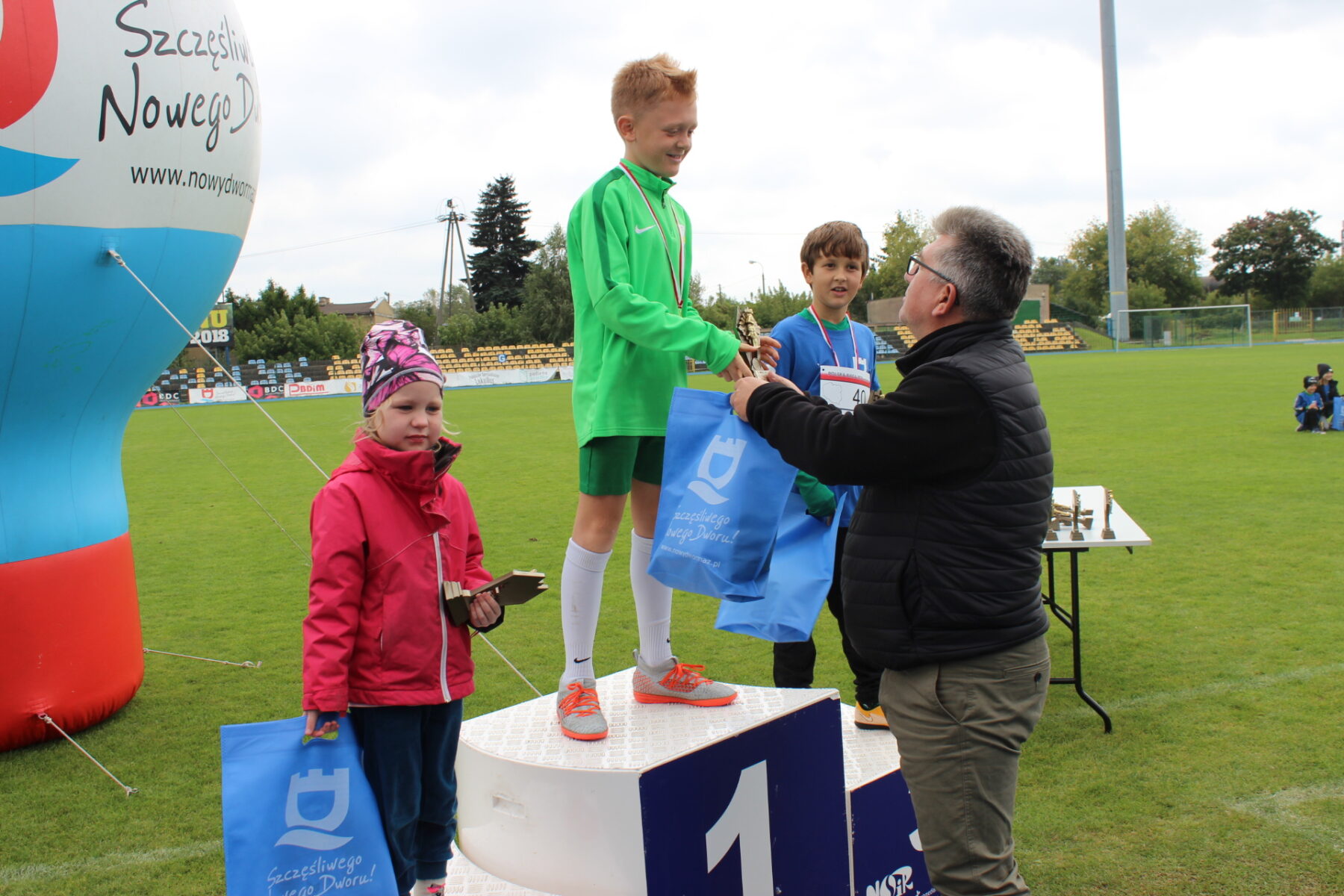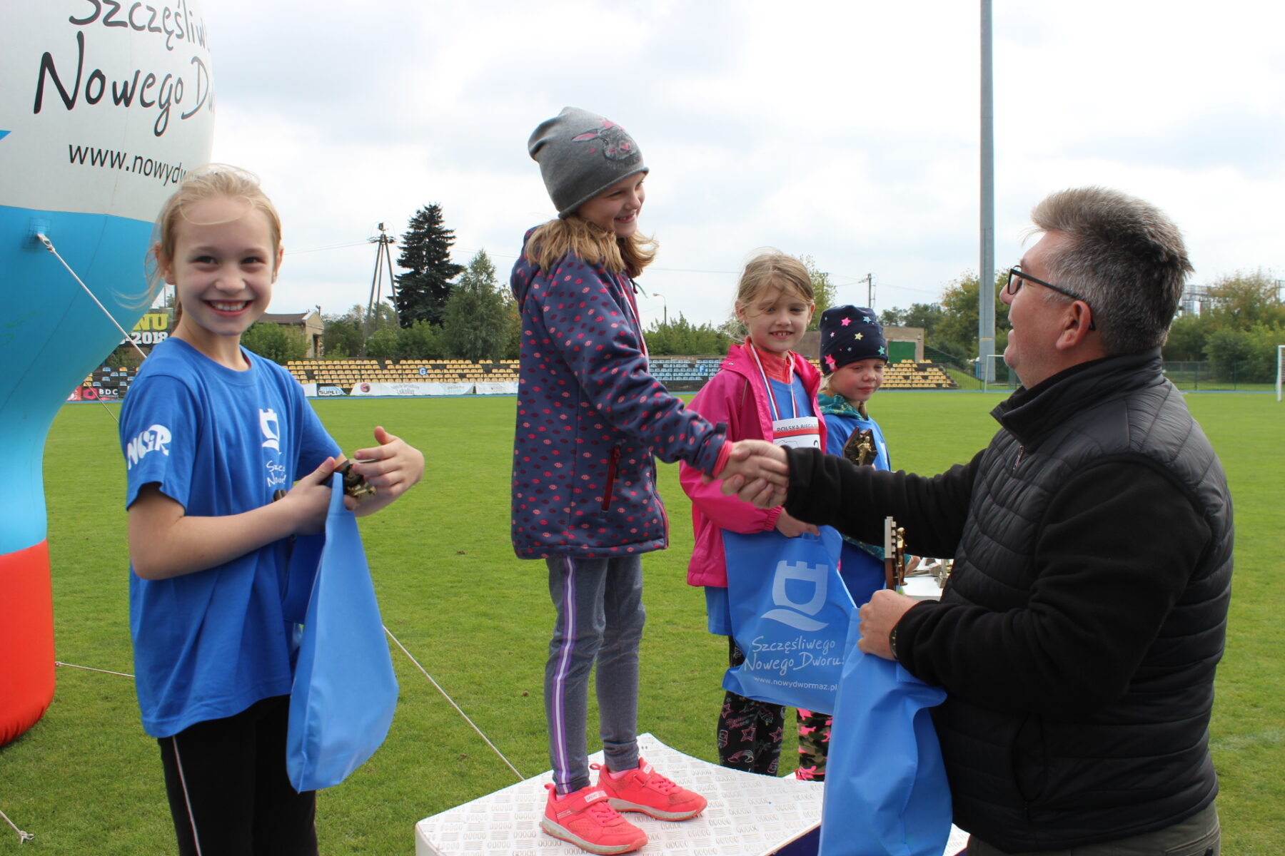 Pomimo początkowo dość jesiennej aury, humory i mobilizacja dopisywały, zwłaszcza wśród najmłodszych biegaczy, dla których to były pierwsze zawody. Przed każdym biegiem Pani Iwona Wicha przeprowadziła również rozgrzewkę. I tu chcielibyśmy wspomnieć, że Pani Iwona to 3-krotna Mistrzyni Europy Juniorów w biegu na orientację (w sztafecie i indywidualnie), a także wice mistrzyni świata w biegach po schodach. Co ciekawe, mąż pani Iwony, jest mistrzem świata w tej samej dyscyplinie. Wszyscy uczestnicy otrzymali pamiątkowe medale oraz wodę, natomiast najlepsi dodatkowo pamiątkową statuetkę oraz upominki, wręczane przez dyrektora NOSiR, Pana Dariusza Wąsiewskiego. Dodatkowo każdy chętny mógł spróbować swoich sił w biegach na orientację, które przeprowadzili PUKS „Młode Orły” Nowy Dwór Mazowiecki był to świetny sprawdzian przed Crossem Złotych Liści, który odbędzie się już 23 października