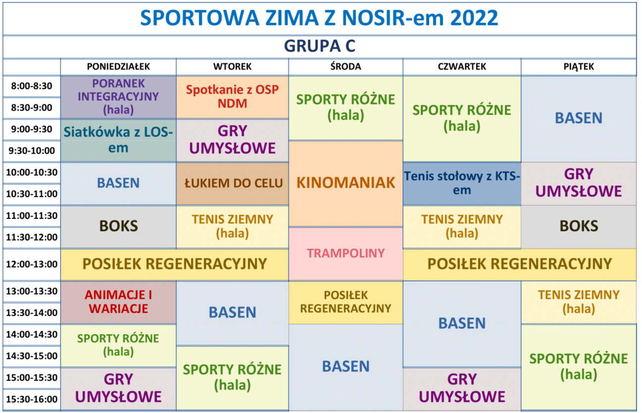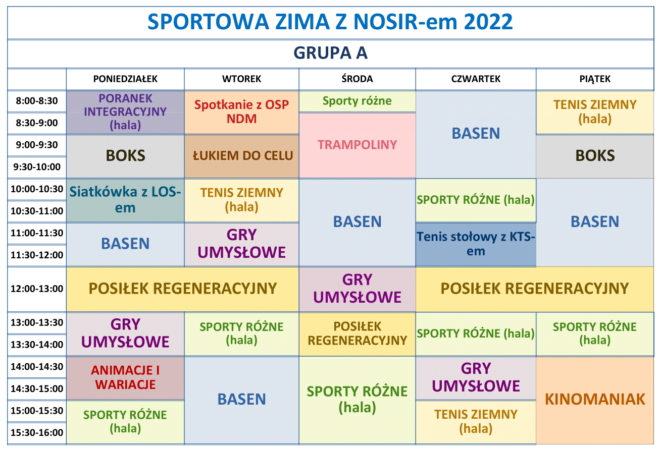 Rodziców/opiekunów prosimy o przygotowanie dla dzieci na czas pobytu w NOSiR-ze bidonu lub plastikowej butelki z napojem (którą w razie potrzeby uzupełniamy wodą), drugiego śniadania lub przekąsek, ponieważ uczestników czeka dużo gier i zabaw ruchowych. W godz. 12:00-13:00 planowana jest przerwa obiadowa, podczas której dzieci otrzymają pełnowartościowy obiad (zupa + drugie danie). Dzieci zobowiązane są do zmiany obuwia na sportowe oraz noszenie maseczki w trakcie przemieszczenia między halą, a basenem lub salą konferencyjną.