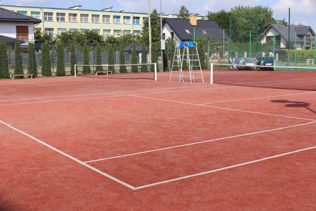 Dwa korty tenisowe o wymiarach 36 m x 18 m brutto o nawierzchni z trawy syntetycznej o powierzchni 1296 m2. Nawierzchnia zbudowana jest z wielofunkcyjnej trawy syntetycznej wypełnionej suszonym i sortowanym piaskiem kwarcowym o granulacji 0.2-0.8 mm 100% polipropylen, odpornej na mróz i wysokie temperatury, ustabilizowane UV, bez skutków ubocznych dla środowiska.