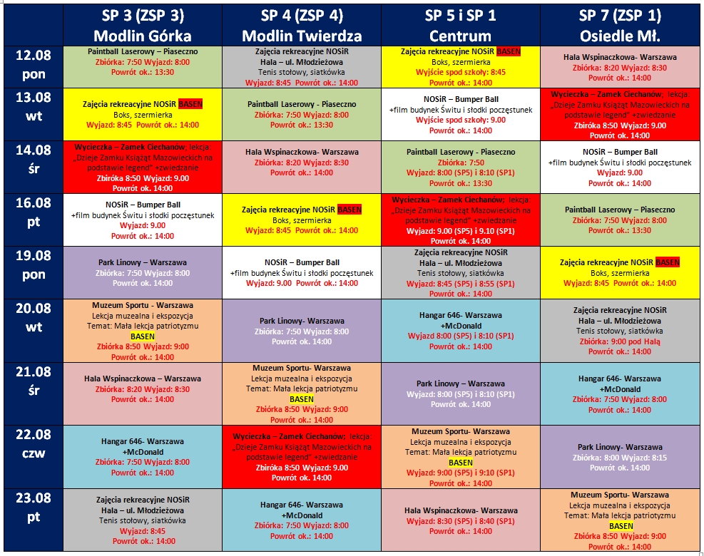 - Zbiórki i powroty uczestników turnusu odbywają się przy szkołach: SP 3, SP 4, SP 5, SP 1 i SP 7.