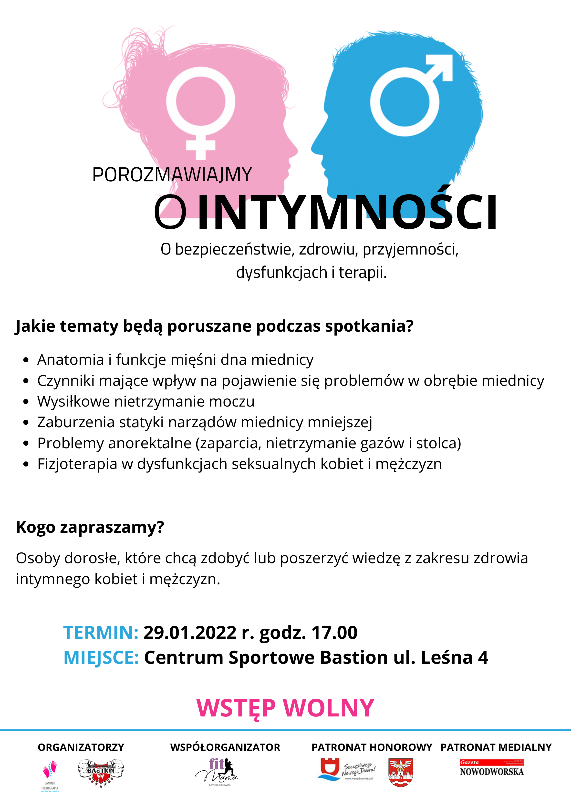 Zapraszamy na spotkanie „Porozmawiajmy w intymności” pod patronatem Burmistrza Nowego Dworu Maz. Jacka Kowalskiego w Centrum Sportowe Bastion, które odbędzie się już w tę sobotę 29 stycznia o godz. 17:00!