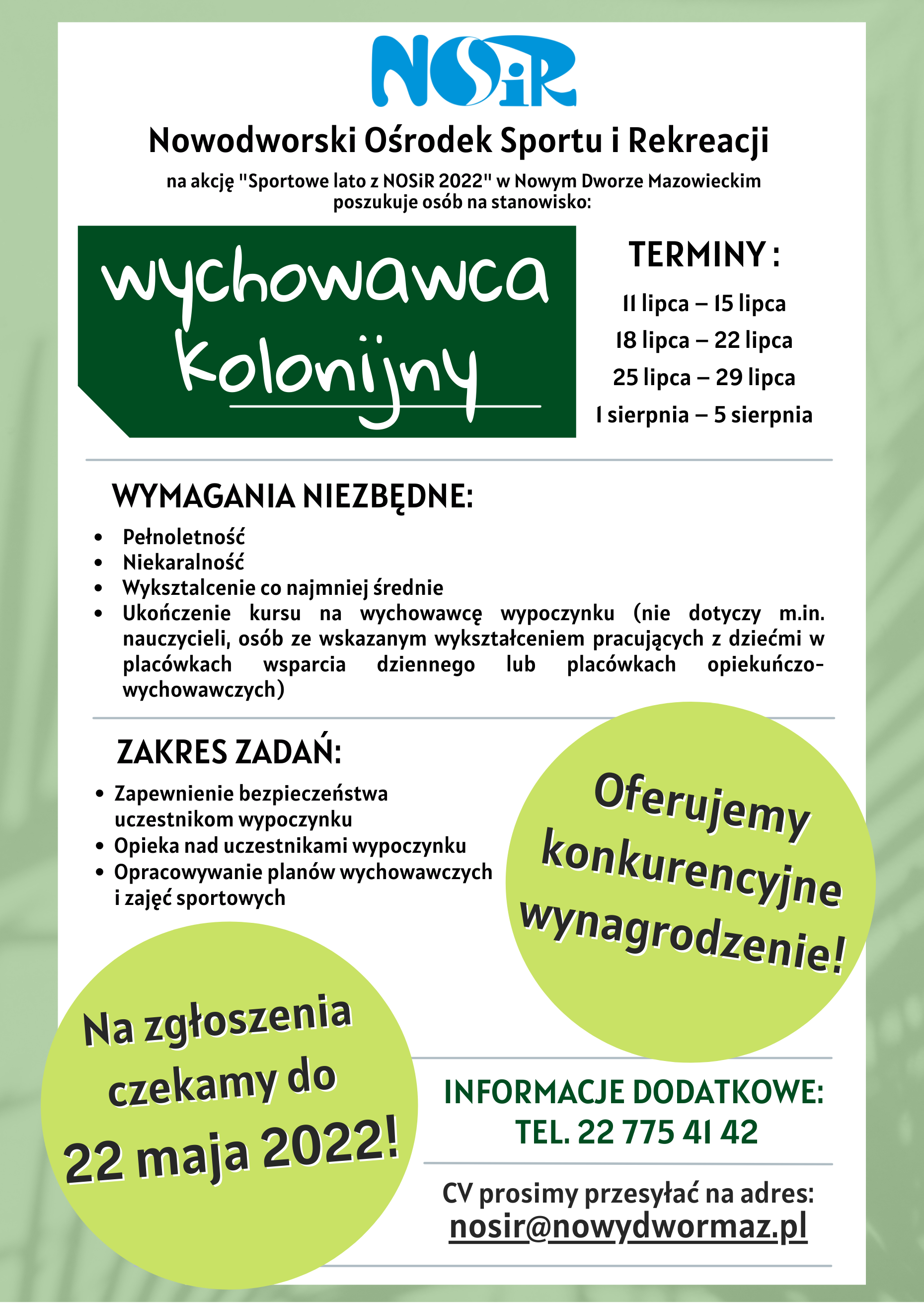 W związku z organizacją akcji „Sportowe lato z NOSiR 2022” poszukujemy wychowawców kolonijnych: