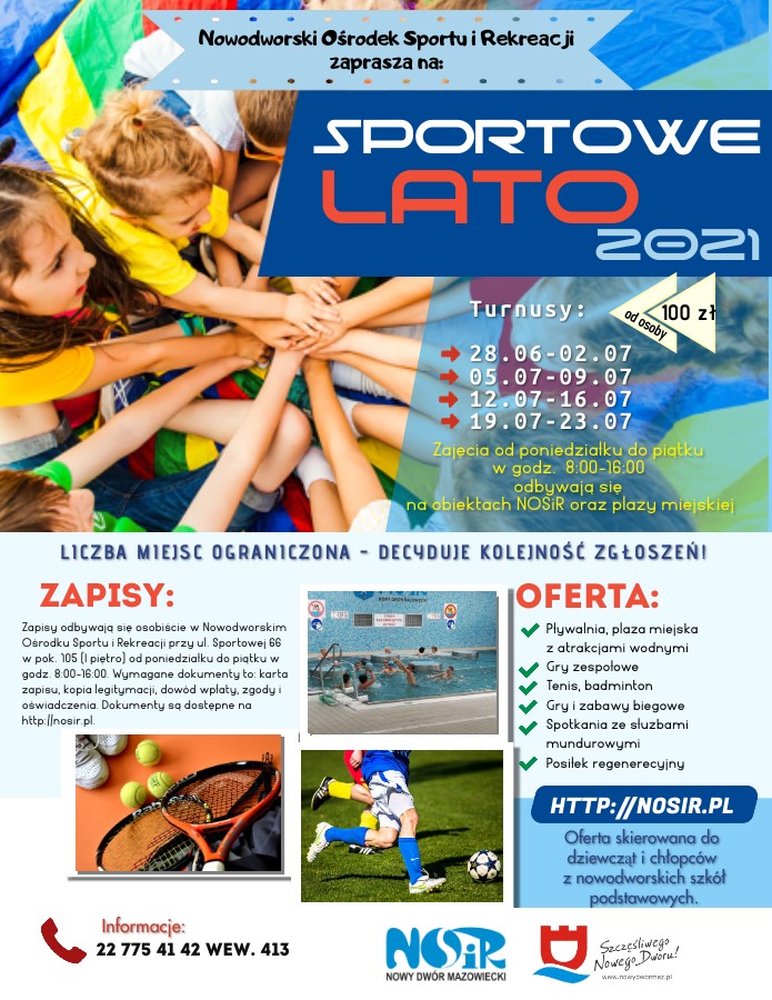 Nowodworski Ośrodek Sportu i Rekreacji zaprasza uczniów nowodworskich szkół podstawowych na Sportowe Lato z NOSiR-em 2021.