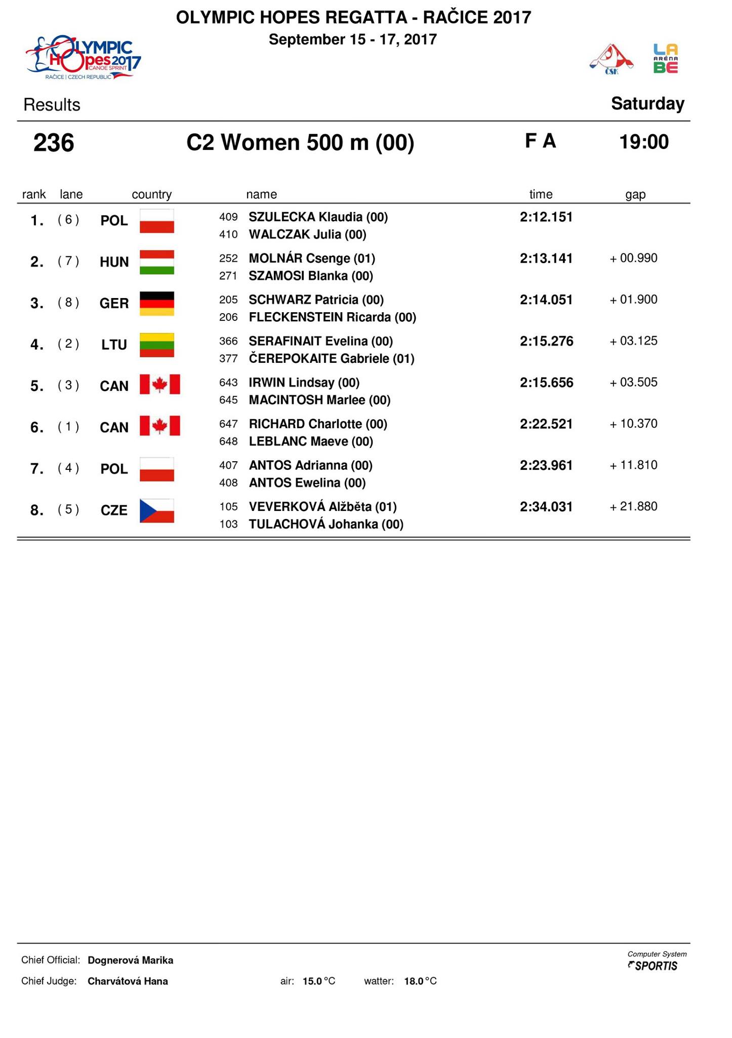 Pierwszy dzień regat piątek to wyścigi na 1000 m i Klaudia tego dnia wystartowała w osadzie C-2 1000 m z Julią Walczak, partnerką z osady. Od początku wyścigu było widać moc u dziewczyn, trzymały się cały czas w czołówce, świetna końcówka na 300 m przed metą i dziewczyny zdecydowanie  zwyciężyły wyścig zdobywając złoty medal.