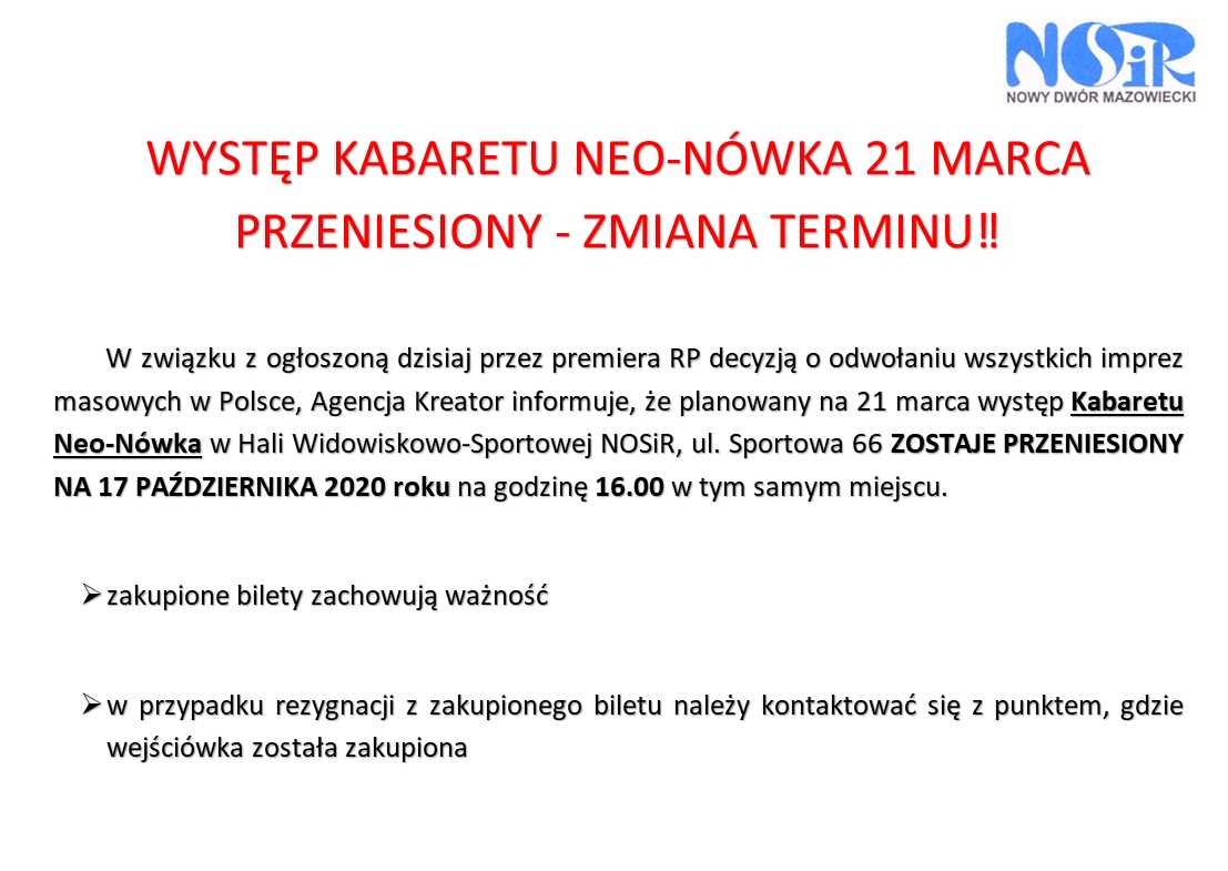 Występ kabaretu Neo-Nówka planowany na 21 marca został PRZEŁOŻONY.