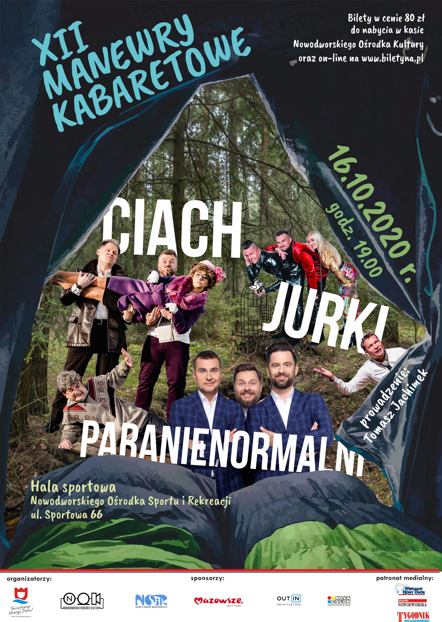 Nowodworski Ośrodek Kultury, Burmistrz Miasta Nowy Dwór Mazowiecki Jacek Kowalski oraz Samorząd Województwa Mazowieckiego mają przyjemność zaprosić na XII Manewry Kabaretowe, podczas których gościć będziemy najlepszych artystów kabaretowych w kraju. Tym razem rozbawiać nas będą: Paranienormalni, Jurki i Ciach. Jako konferansjer wystąpi niezastąpiony Tomasz Jachimek.
