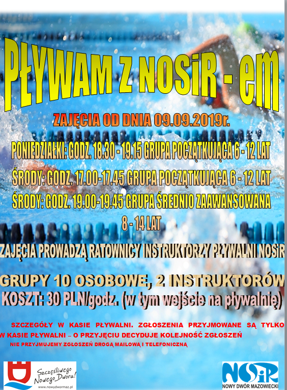 9 września 2019 roku rozpoczną się zajęcia z nauki pływania dla dzieci w wieku 6-14 lat. Więcej informacji dla plakacie.
